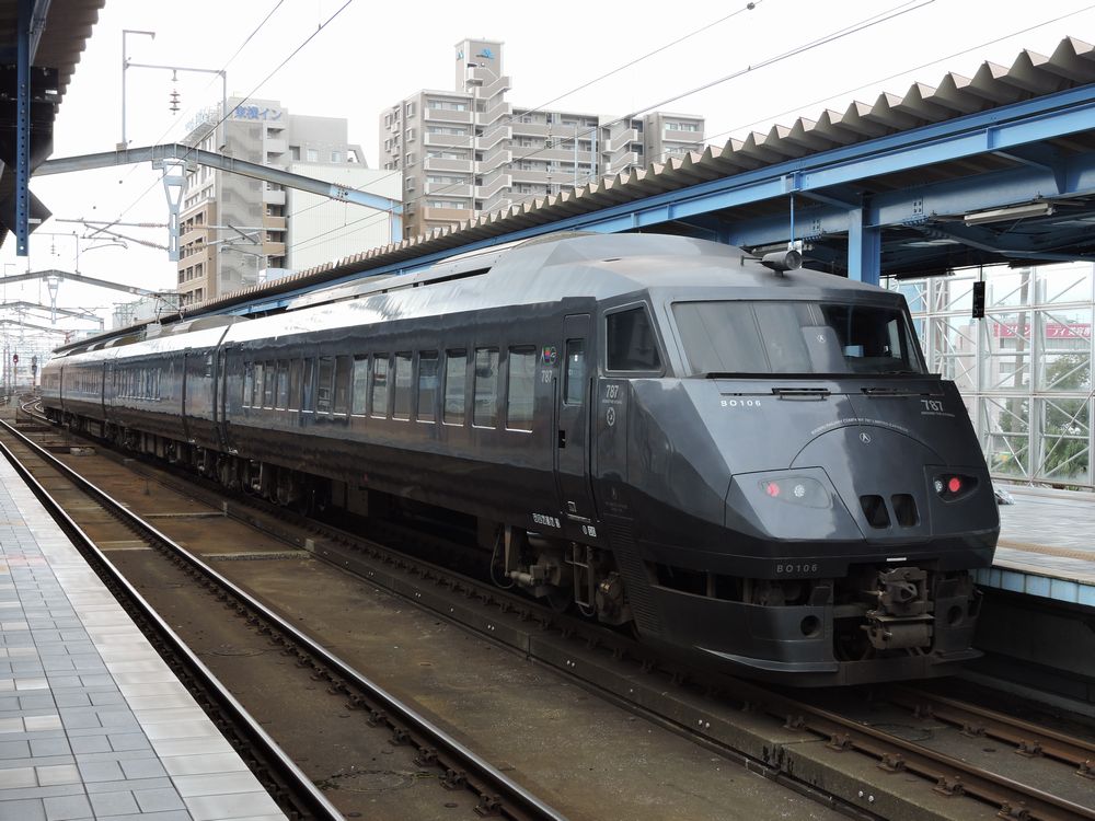 新幹線800系電車(久留米駅) 「さくら」は山陽・九州新幹線の速達タイプの列車で、山陽新幹線内では「ひかり」と同等の位置付けとなっている。「さくら」の名称は「みずほ」と同じく元々九州方面の寝台列車に使用されていたもので、2011年の九州新幹線全線開業時に新たに新幹線特急の名称として設定された。 山陽新幹線内では従来の「ひかりレールスター」を置き換える形で1時間に1~2本が運行されている。車両はN700系7000/8000番台と800系で、後者は九州新幹線完結の運用のみとなっている。 運行区間 新大阪・広島・新下関・博多~熊本・鹿児島中央 経由線区 山陽新幹線・九州新幹線 停車駅 新大阪-新神戸-(姫路)-岡山-福山-広島-(徳山)-(新山口)-(新下関)-小倉-博多-新鳥栖-久留米-(筑後船小屋)-(新大牟田)-(新玉名)-熊本-(新八代)-(新水俣)-(出水)-川内-鹿児島中央 ※カッコ内は一部列車が停車 787系電車(博多駅)