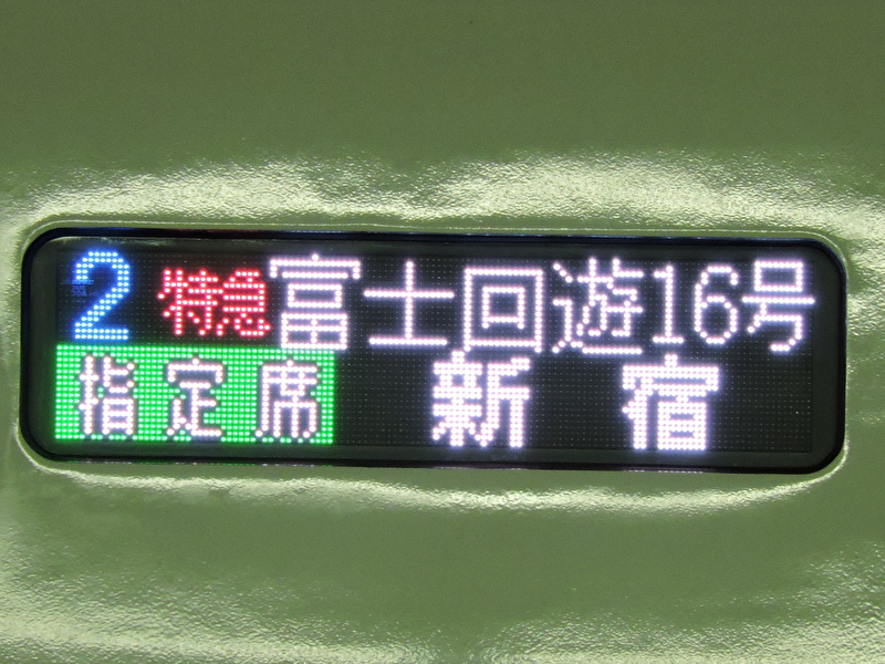 「富士回遊」はJR東日本・富士急行線直通特急として2019年にデビューした。元々富士急行線には「中央特快」などの通勤電車の他、臨時快速「ホリデー快速富士山」や特急「成田エクスプレス」の延長運転などでJR線との直通運転の実績はあったが、定期の特急列車では「富士回遊」が初めてとなる。 車両はE353系で、3両の付属編成のみが使用されている。大月以東の区間は特急「あずさ」「かいじ」と併結運転を行っており、このうち1本は千葉発着の「あずさ3号」との併結となる。 臨時列車ではE257系が使用されることもある。 全車指定席で運行されるが、富士急行線内のみの利用では座席の指定ができないため、座席未指定券での乗車となる。ただし富士山~河口湖間は乗車券のみで利用できる。 運行区間 千葉・新宿~河口湖 経由線区 総武本線・中央本線・富士急行線 停車駅 千葉-船橋-錦糸町-新宿-立川-八王子-大月-都留文科大学前-下吉田-富士山-富士急ハイランド-河口湖 253系1000番台電車(新宿駅)